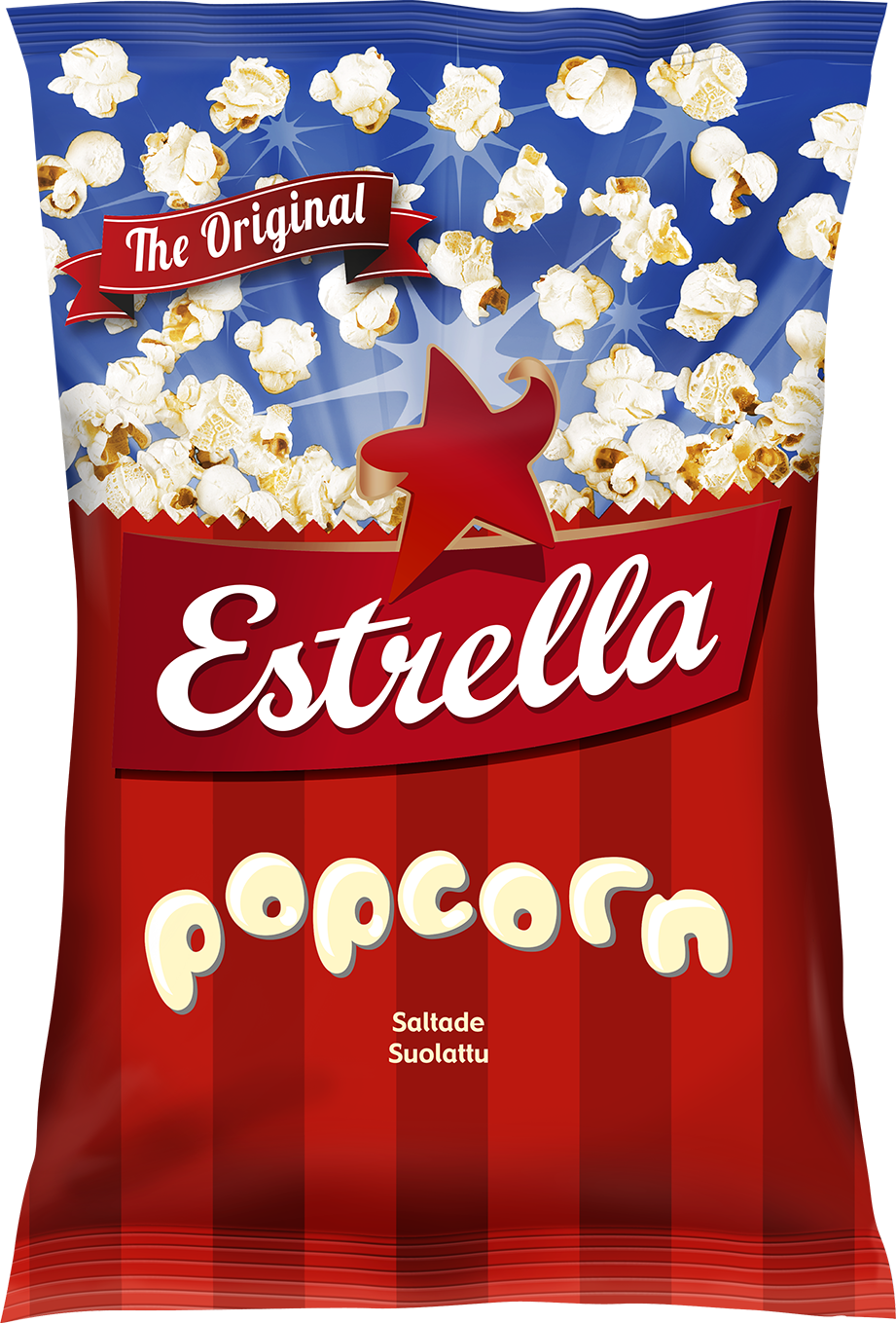 Estrella Färdigpoppade Popcorn Salt är originalet och det givna valet för alla popcornälskare. Extra fluffiga, färdigpoppade popcorn med härlig sälta och perfekt tuggmotstånd. Riktiga biopopcorn som passar filmkvällen, seriemaraton, parkhäng och alla andra snackstillfällen året runt. Ready to eat och perfekta att dela med kompisen.